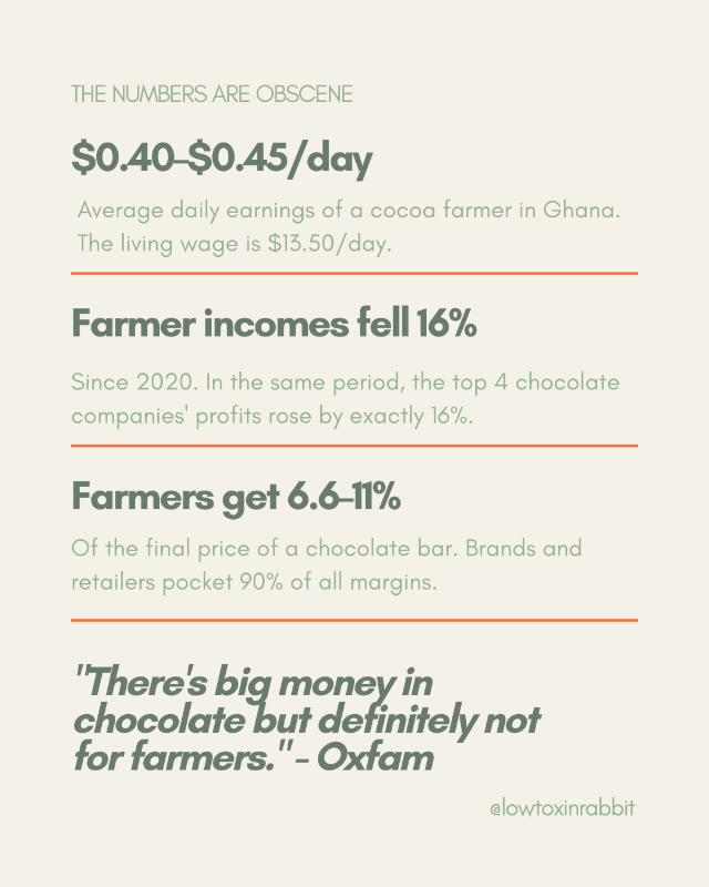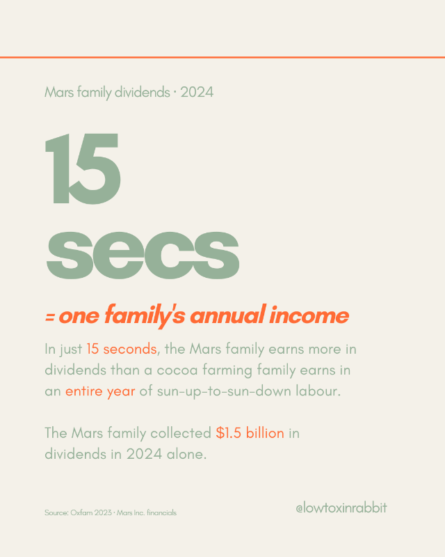 Let that land for a second. In just 15 seconds, the Mars family earns more in dividends than a cocoa farming family earns in an entire year of gruelling, sun-up-to-sun-down labour.