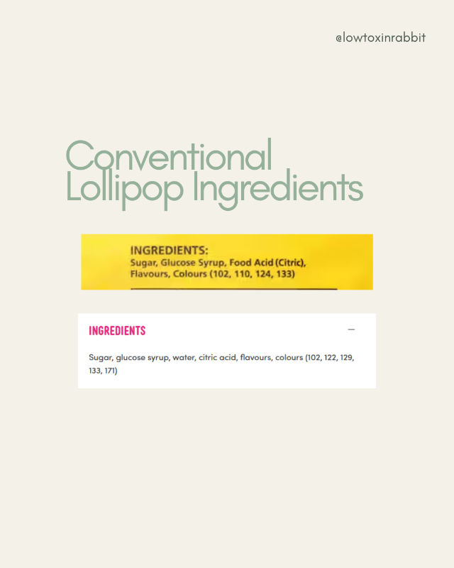 From a choking perspective, lollipops on a stick are generally not recommended for children under three. From an ingredient perspective, toddlers are more susceptible to synthetic dye exposure due to their smaller body weight, so if you do give a lollipop to an older toddler who can eat one safely, choosing one coloured with fruit and vegetable concentrates is a much better option than one containing synthetic azo dyes.